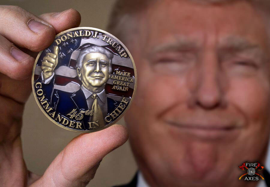 President Donald Trump POTUS MAGA Presidential Collectible Challenge Coin. Own a piece of US presidential history with this President Donald Trump POTUS Presidential Challenge Coin. At 2 inches it is a US president commemorative challenge coin with the details and original artwork like no other. As a challenge coin OEM, we produce, design and coordinate the manufacturing of top of the line fire fighter challenge coins like this President Donald Trump POTUS Presidential Challenge Coin. One of our designs literally is on the challenge coin holder sitting behind President Trump. A fact we are somewhat proud of.  At 2 inches with incredible detail and displaying in color with antique gold and solver plating is a challenge coin that will be sure to impress and be a proud part of your challenge coin collection.